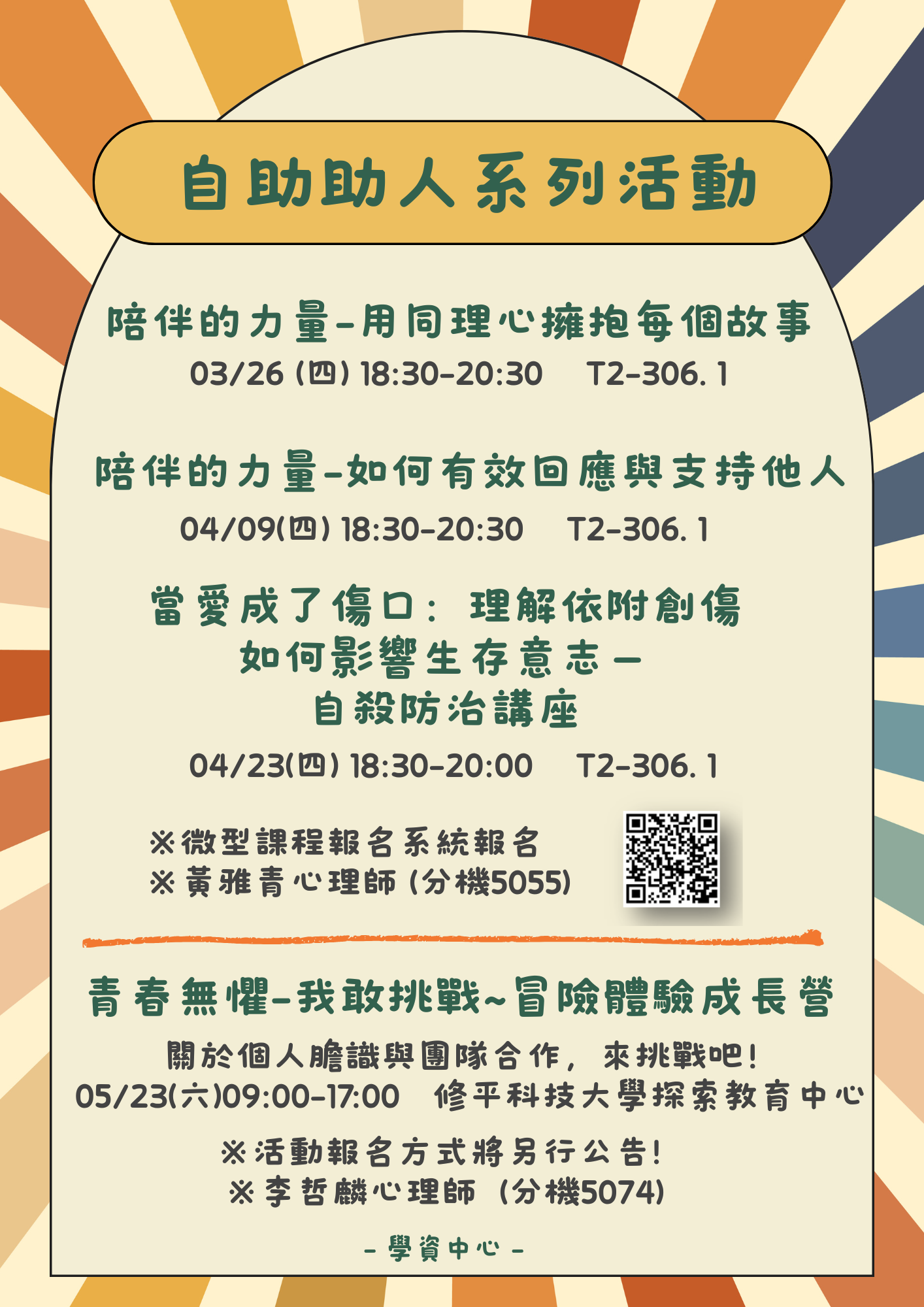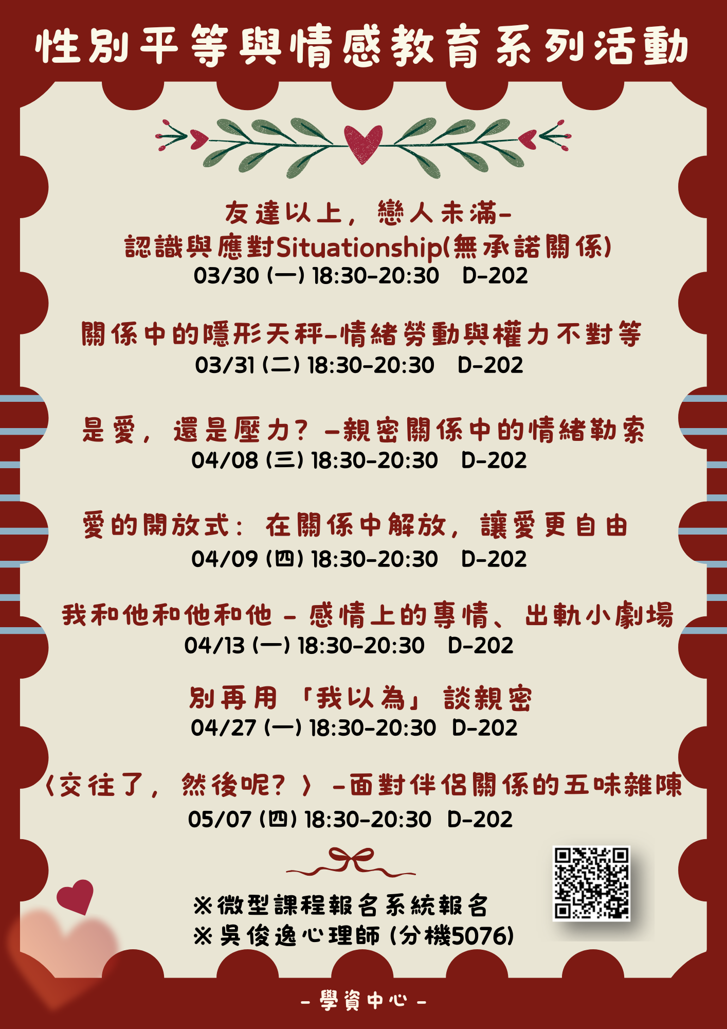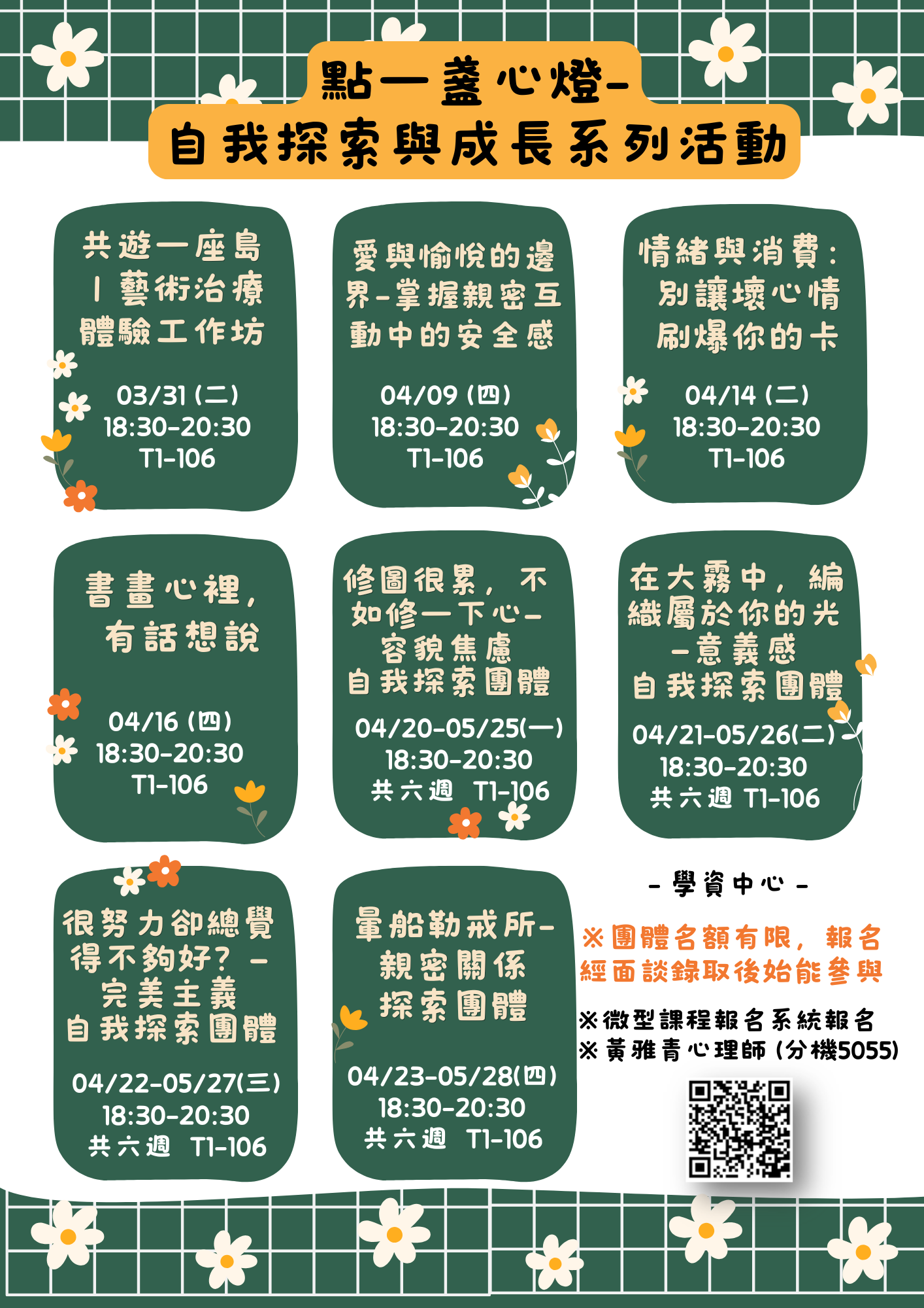 無論是想釋放壓力、提升人際關係、親密關係、自我照顧技巧,歡迎你來參加,安穩地開啟這學期!
