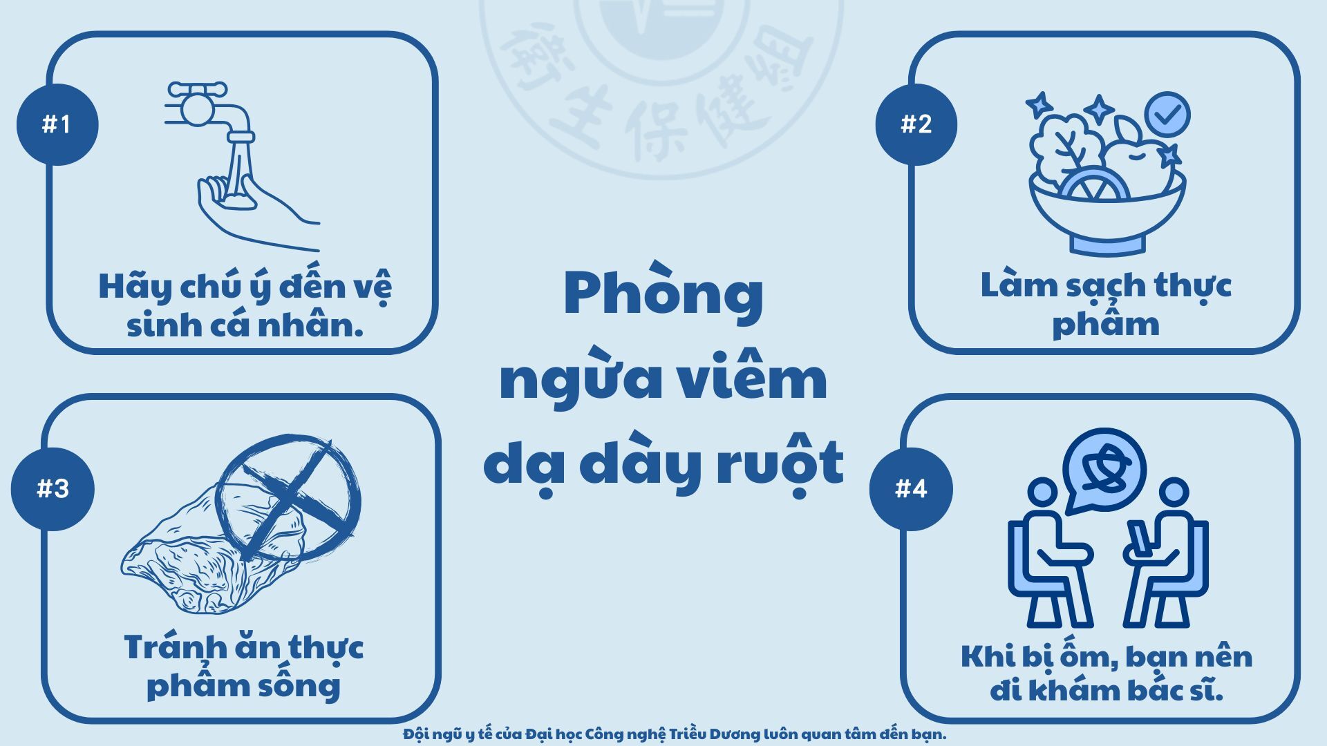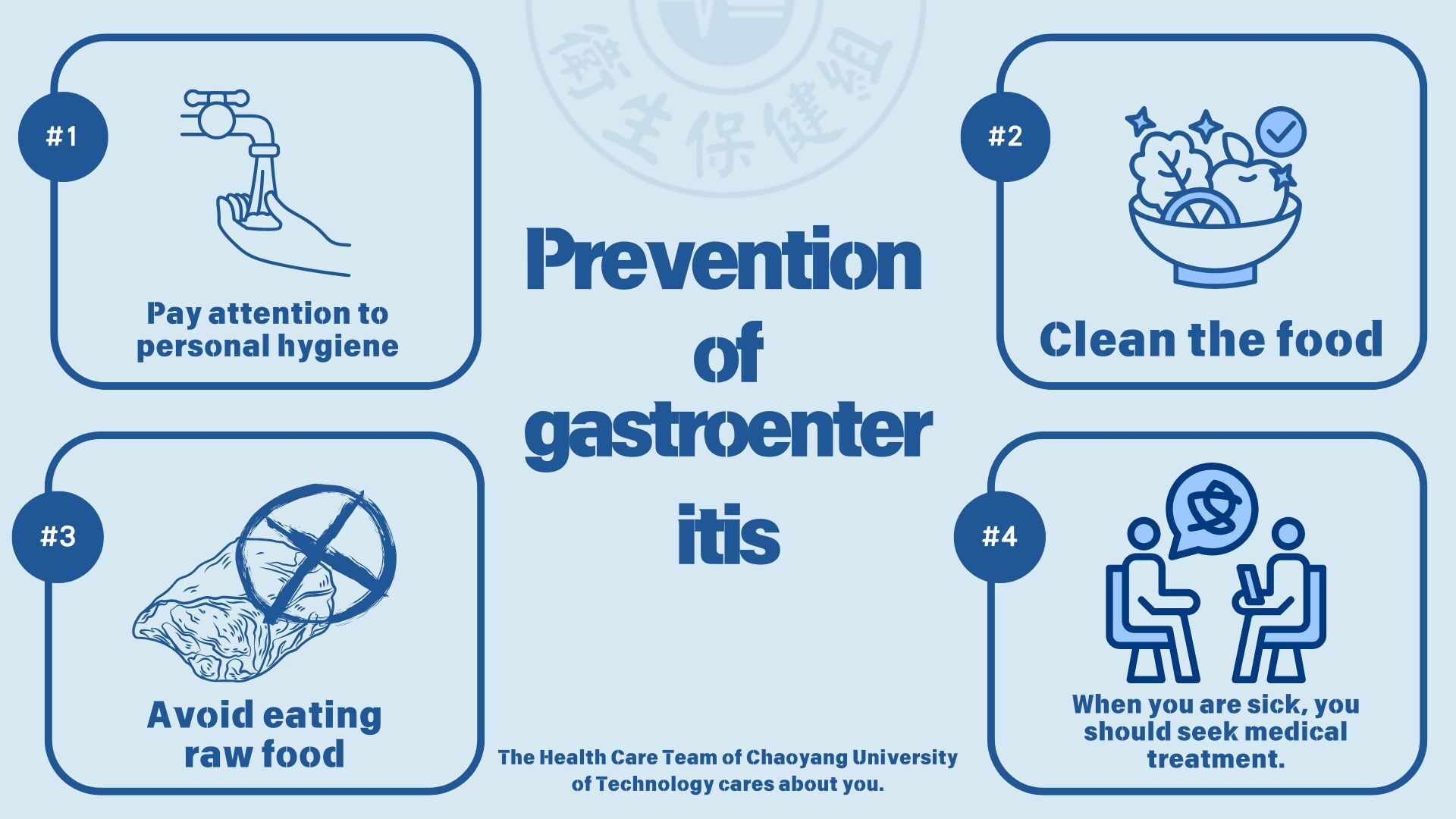 - 飯前、如廁後、與腸胃炎的個案接觸後,均應加強洗手。