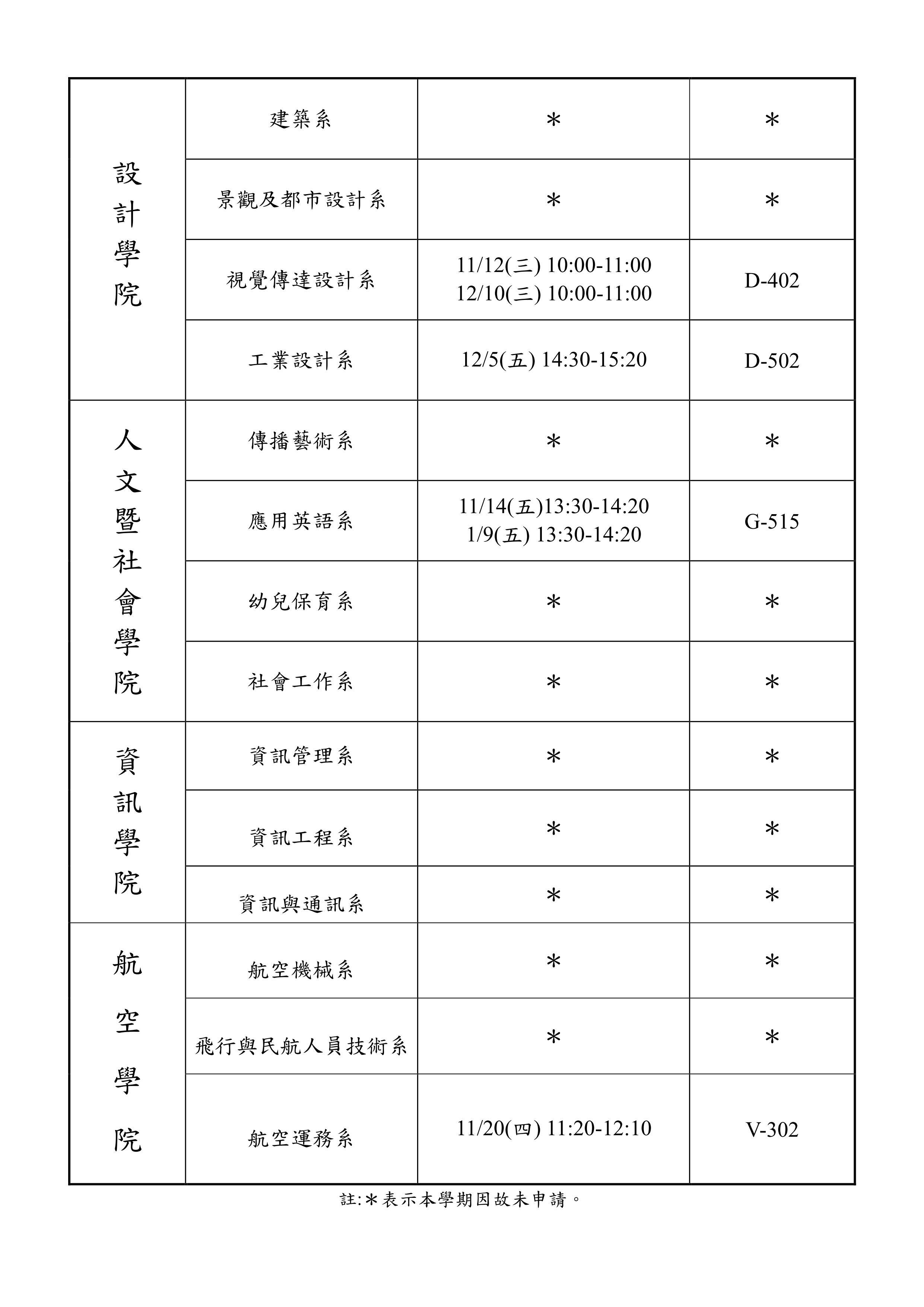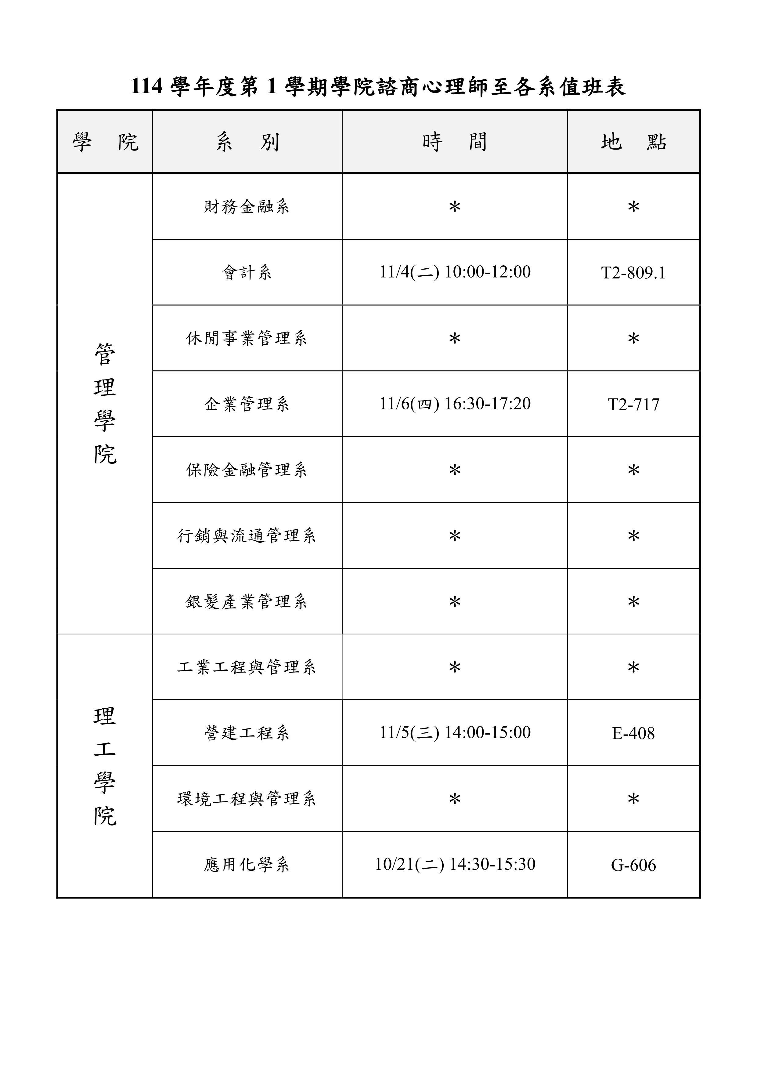 114-1 系心理師至各系值班表 (*代表該系本學期未申請心理諮詢值班)