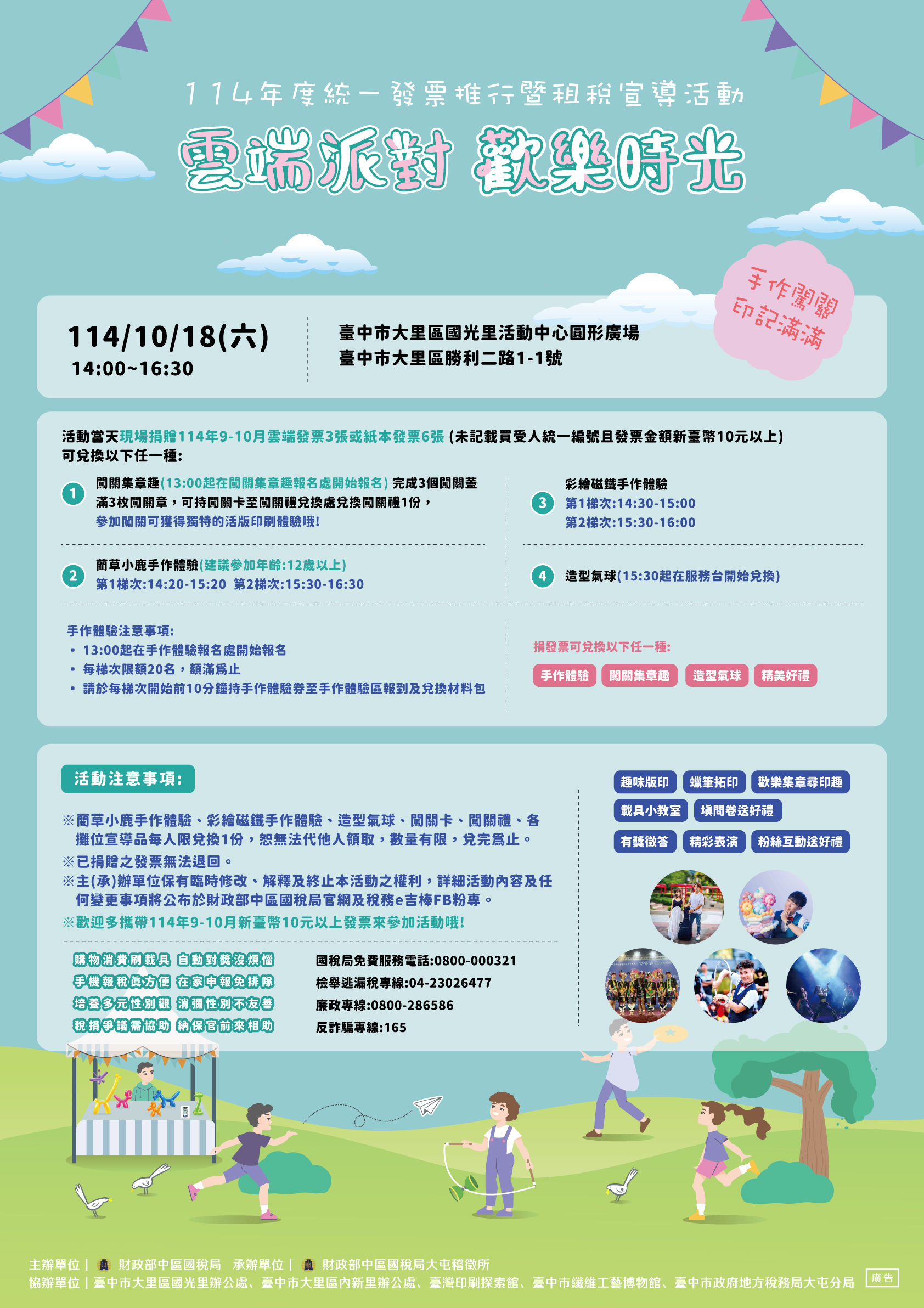 六、宣傳文字:大屯稽徵所於114年10月18日14:00-16:30在大里區國光里活動中心圓形廣場舉辦雲端派對歡樂時光活動(13:00受理闖關及手作現場報名),捐贈114年9-10月10元以上且無買方統編的雲端發票3張或紙本發票6張可兌換闖關、手作或造型氣球,另外還有獨特版印、精彩表演及多樣宣導攤位,歡迎多攜帶發票來參加。
