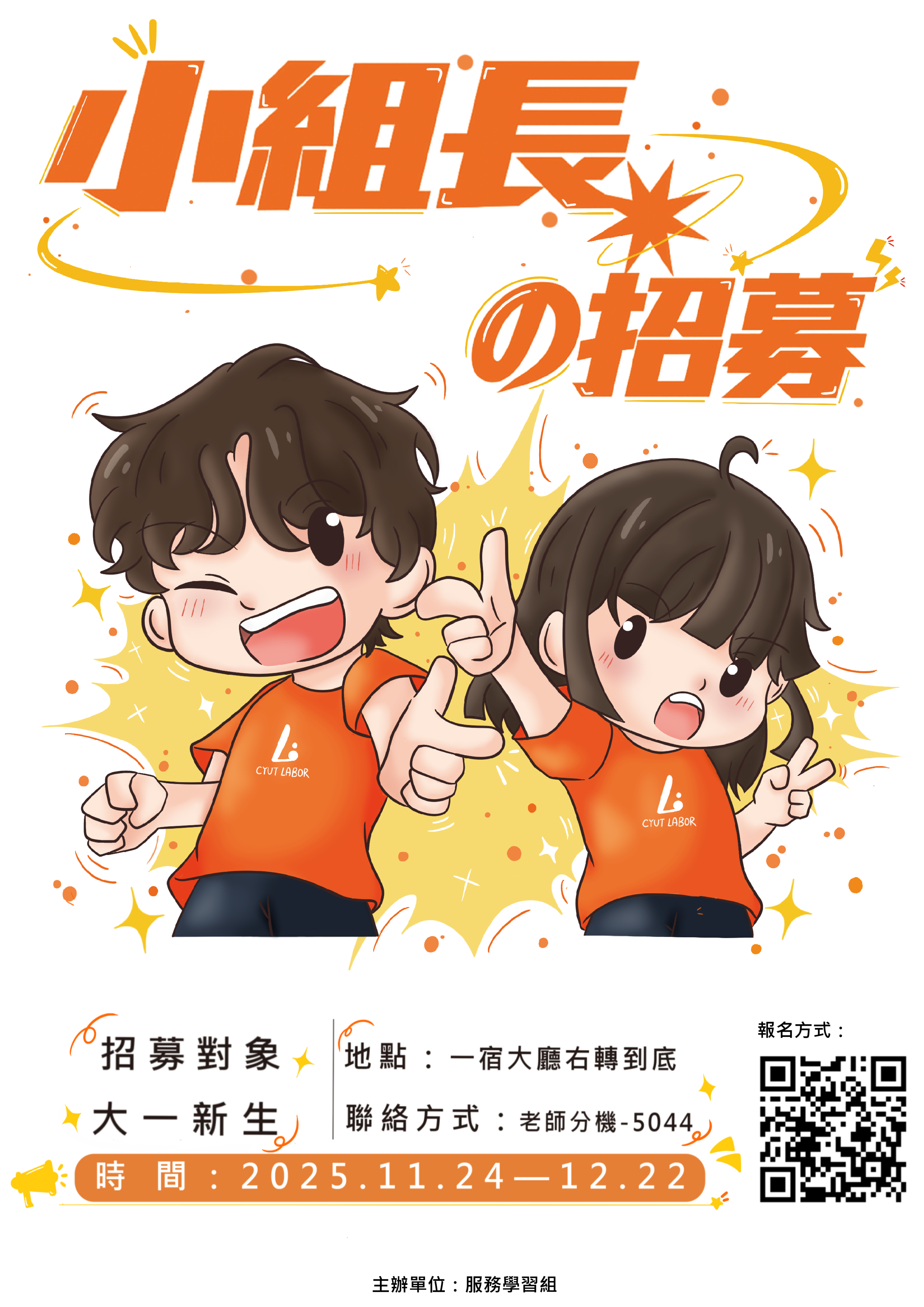 為培養學生服務精神、領導能力與團隊協作技巧,服務學習組自即日起辦理 「勞作小組長招募」,歡迎114學年度新生踴躍參與!